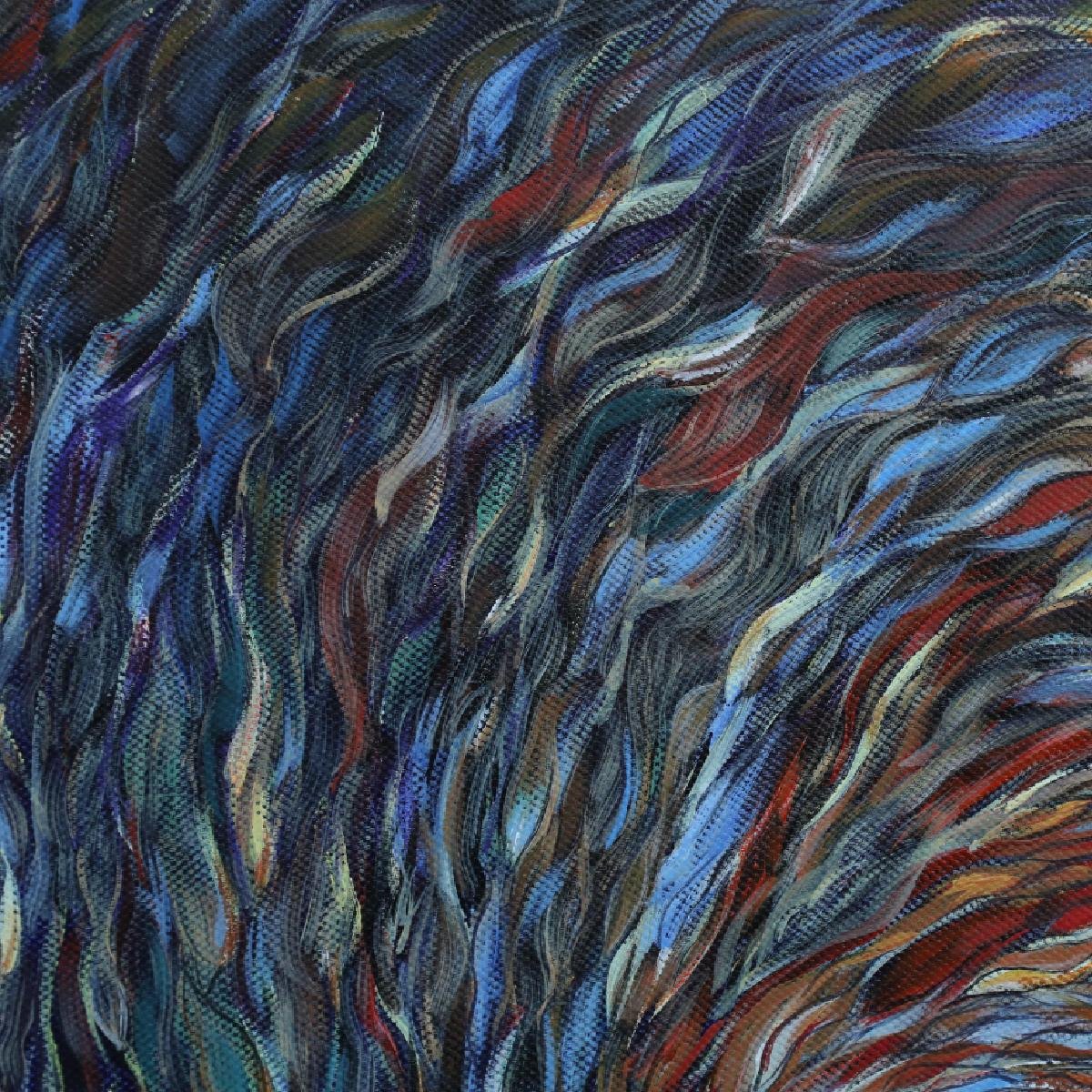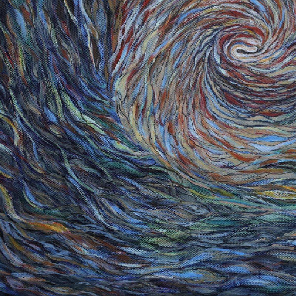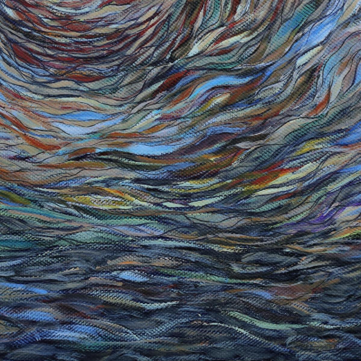 • 创作这幅作品时,已融入画中的世界,与色彩和线条共舞、与具象和抽象交融;脑海中,夕阳西下,余晖倾洒于海面,浪潮被渲染得五彩斑斓,宛如梦幻。不知不觉,每一道波纹、每一朵浪花都被画笔赋予鲜活的生命,闪耀着各式金光,它们相互交织、碰撞、融合;此刻,我也变成在海边遐想的少女,思绪飞扬,仿佛听着海浪的呢喃;爱,在此刻显得如此伟大。爱包容了所有黑暗,接纳了一切事物,无论是美好还是丑陋,善良还是邪恶,都在爱的怀抱里找到了存在的价值;爱,允许所有生命的延续,让每一次的诞生和消逝都成为宇宙运行的画卷。