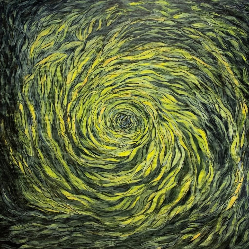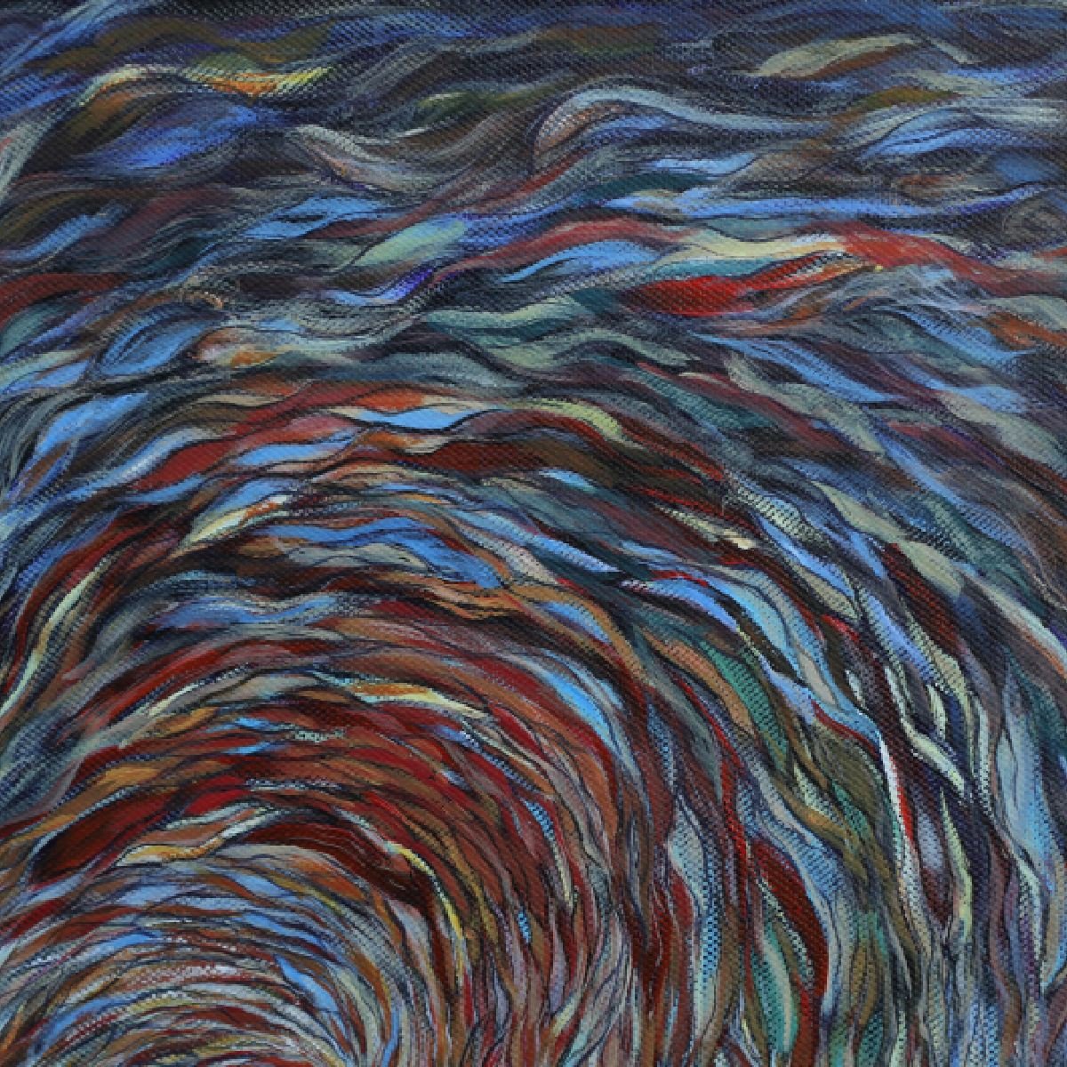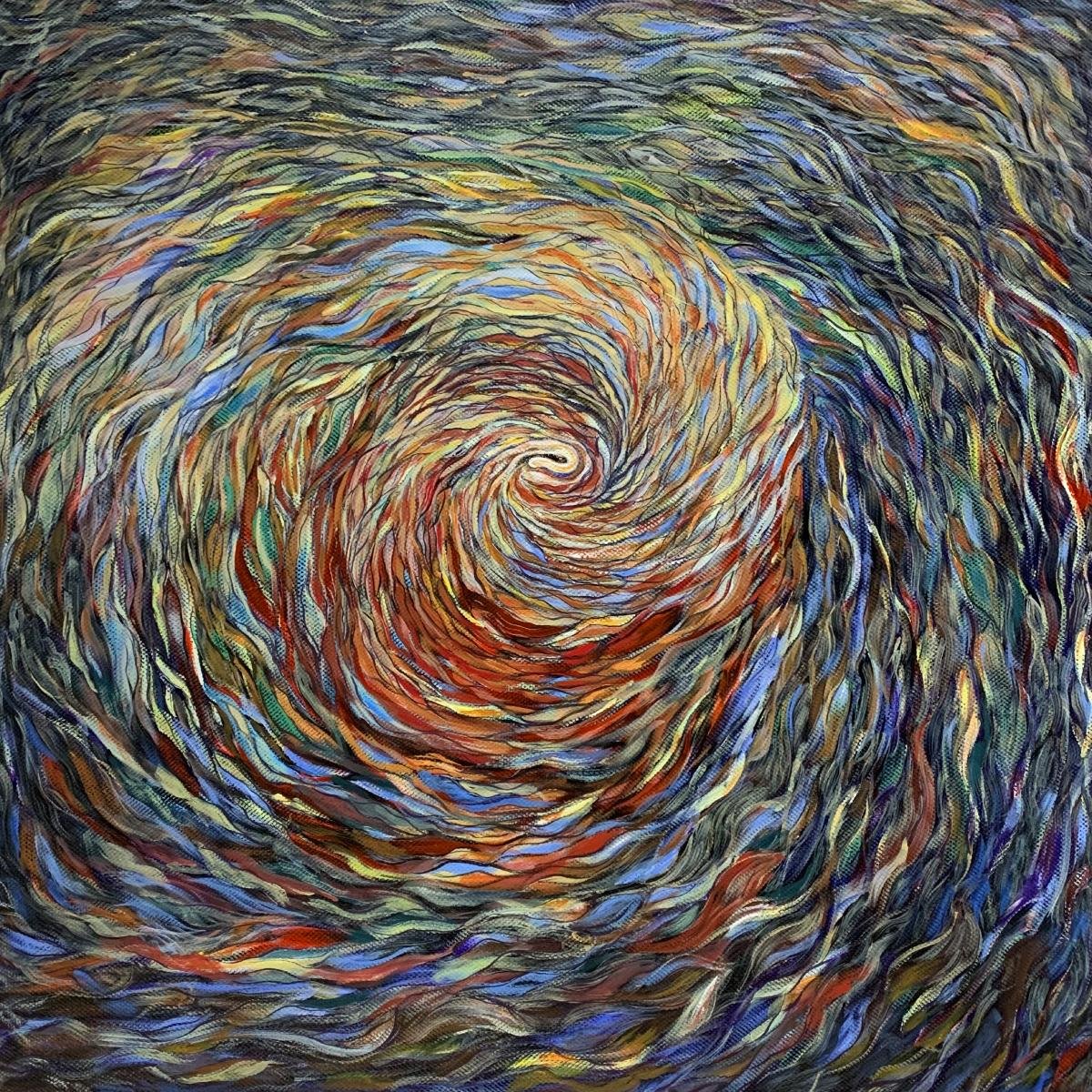 • 创作这幅作品时,已融入画中的世界,与色彩和线条共舞、与具象和抽象交融;脑海中,夕阳西下,余晖倾洒于海面,浪潮被渲染得五彩斑斓,宛如梦幻。不知不觉,每一道波纹、每一朵浪花都被画笔赋予鲜活的生命,闪耀着各式金光,它们相互交织、碰撞、融合;此刻,我也变成在海边遐想的少女,思绪飞扬,仿佛听着海浪的呢喃;爱,在此刻显得如此伟大。爱包容了所有黑暗,接纳了一切事物,无论是美好还是丑陋,善良还是邪恶,都在爱的怀抱里找到了存在的价值;爱,允许所有生命的延续,让每一次的诞生和消逝都成为宇宙运行的画卷。