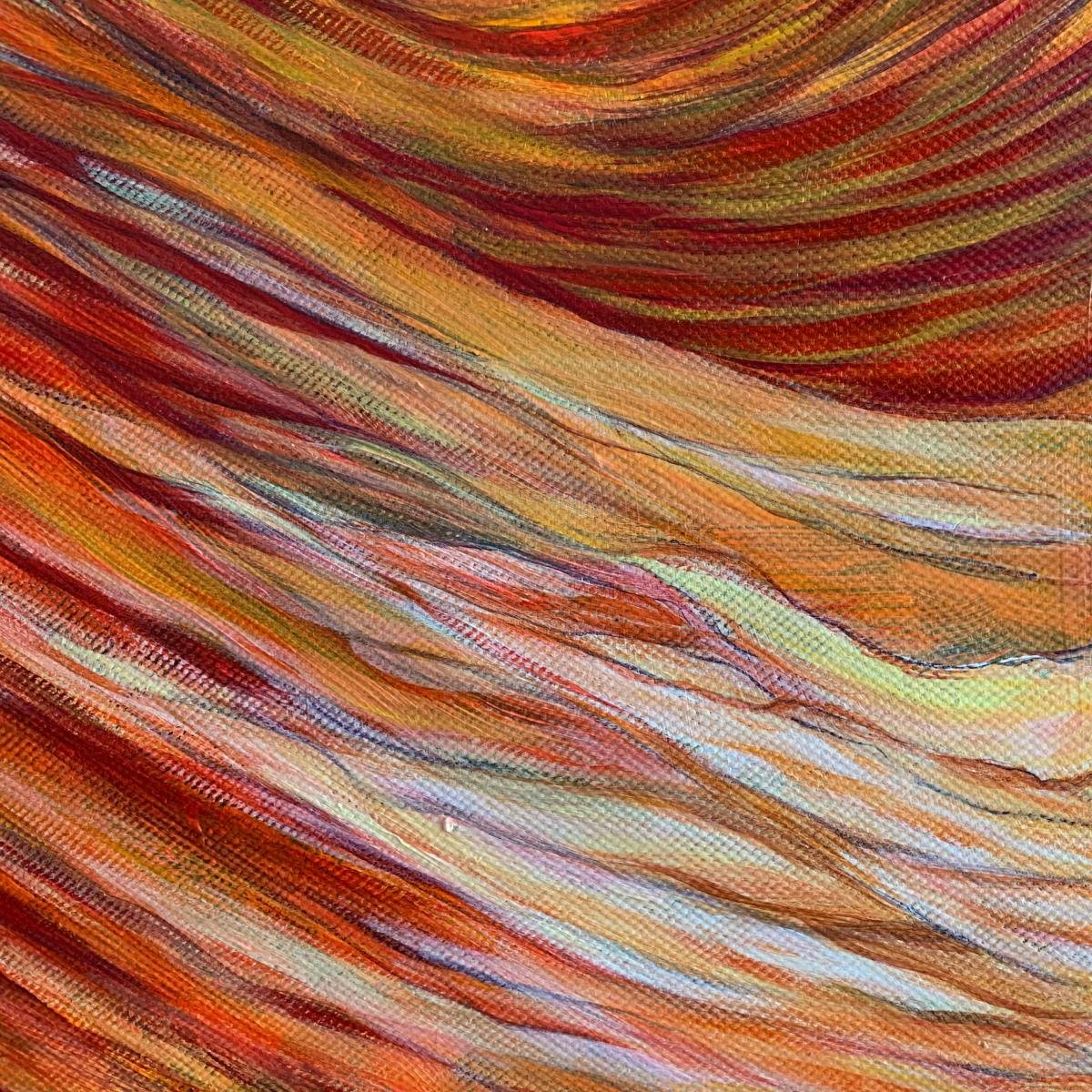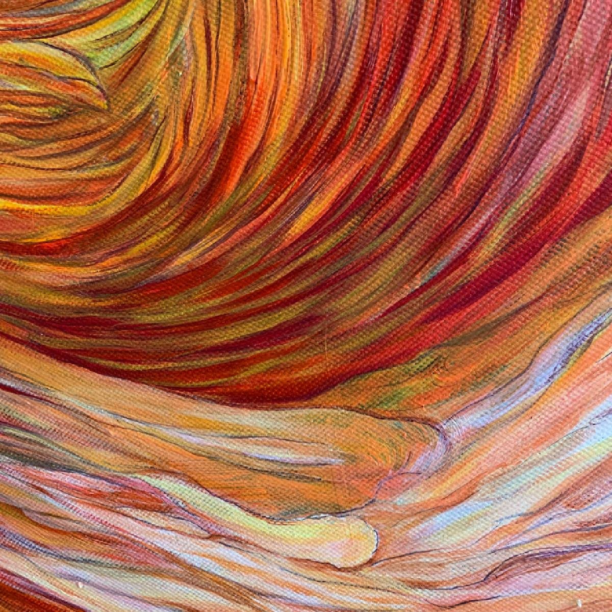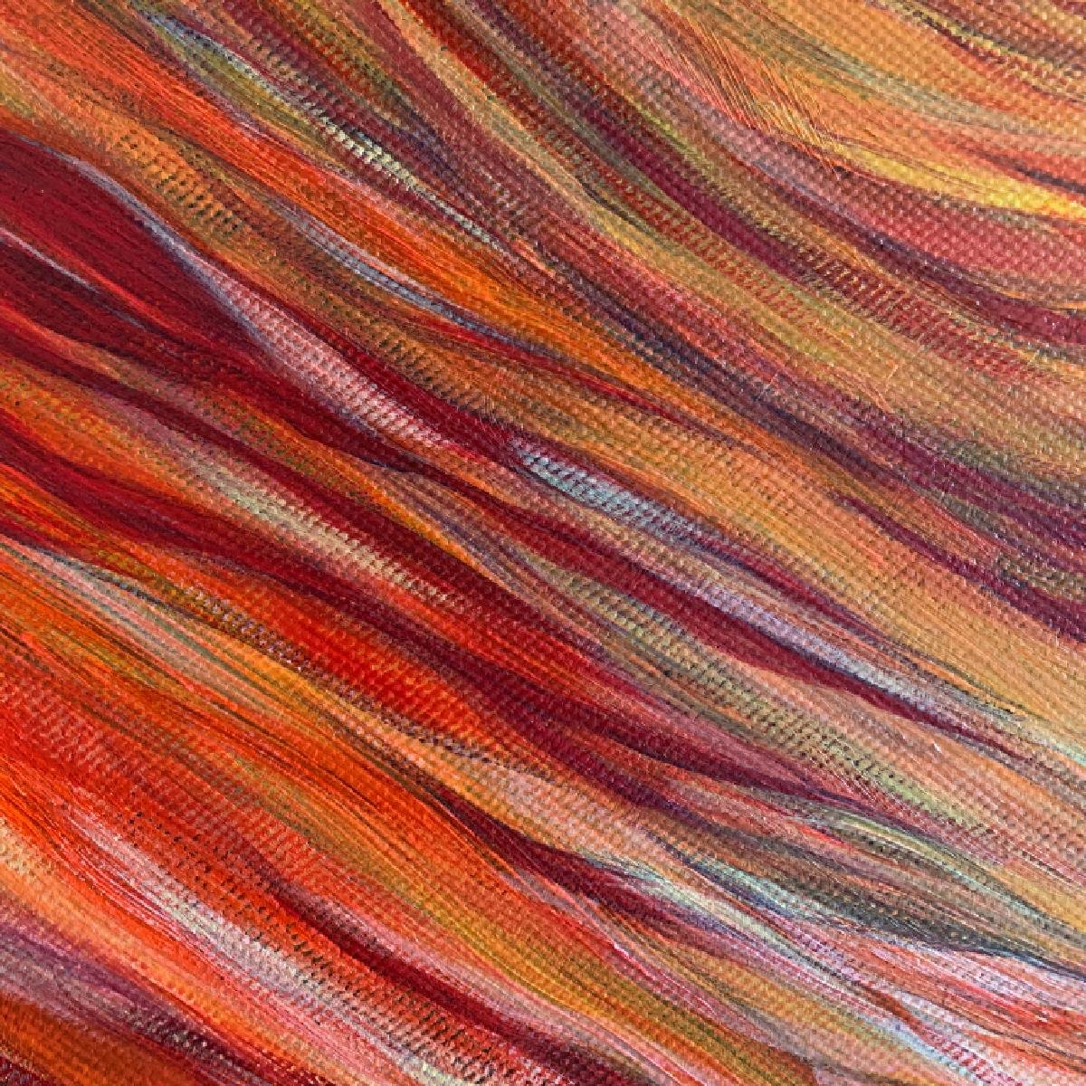 - A swirl of warm colors, reds, oranges, and yellows, creates an atmosphere reminiscent of flame or sunset light, expressing growth, change, transformation, creativity, inspiration, and vitality. It represents inner strength and resilience, appearing both figurative and abstract. The illusion of movement in between creates a magical feeling. A burning dream. Sunlight, like a mysterious symbol, tells an unknown story, a melody of life in full bloom.